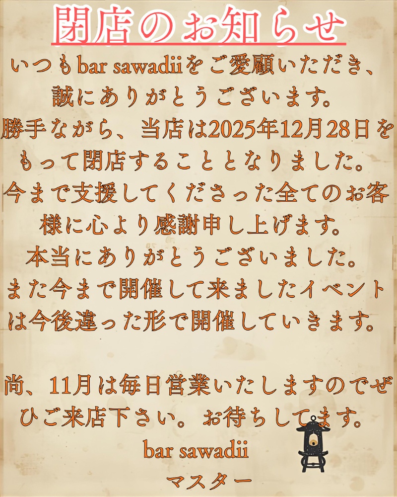 | 営業時間 | 営業時間 ⚪︎月曜〜土曜 20時〜0時 ⚪︎定休日 日曜 |